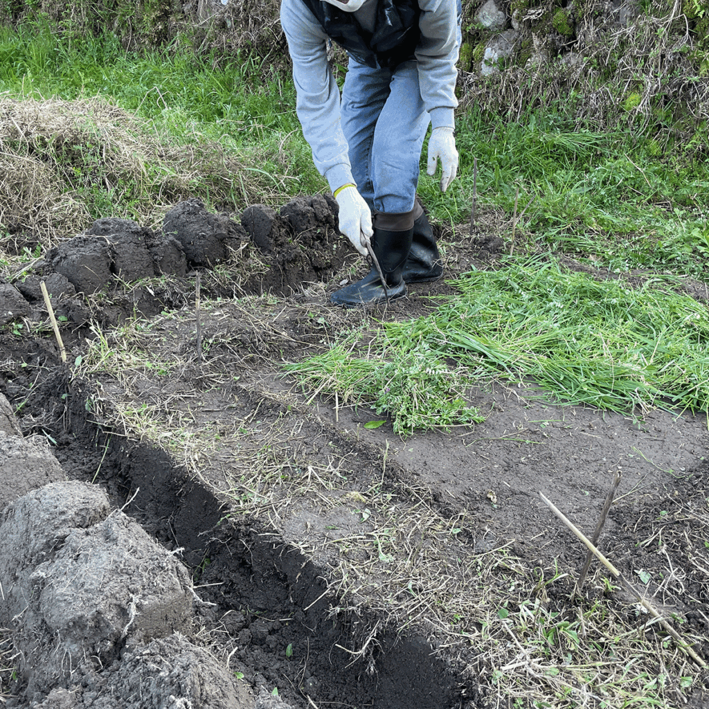 周囲にモグラ侵入防止の溝を掘り、表土を削る。草の根を取り、種を下ろし、土を被せる。